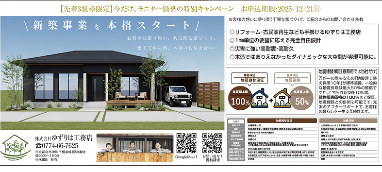 そしてこの本格スタートを記念し、先着3組様限定で、ゆずりは工務店の高性能な注文住宅を「モニター特別価格」でご提供するキャンペーンを実施中です。